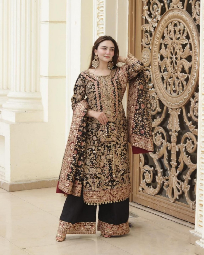 The Angrakha features heavy dabka, stara, and resham handwork on the body, creating an intricate and captivating design. The front slit adds a modern touch, enhancing the overall elegance of the ensemble.